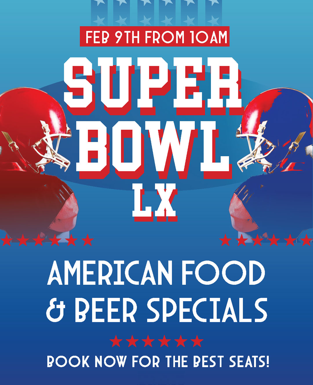 We’re opening from 9am with the game live and loud, the best seats in the house, and a full all-American food menu to keep you fuelled from kickoff to the final whistle. Expect beer specials, big screens, and the kind of atmosphere only game day can deliver.